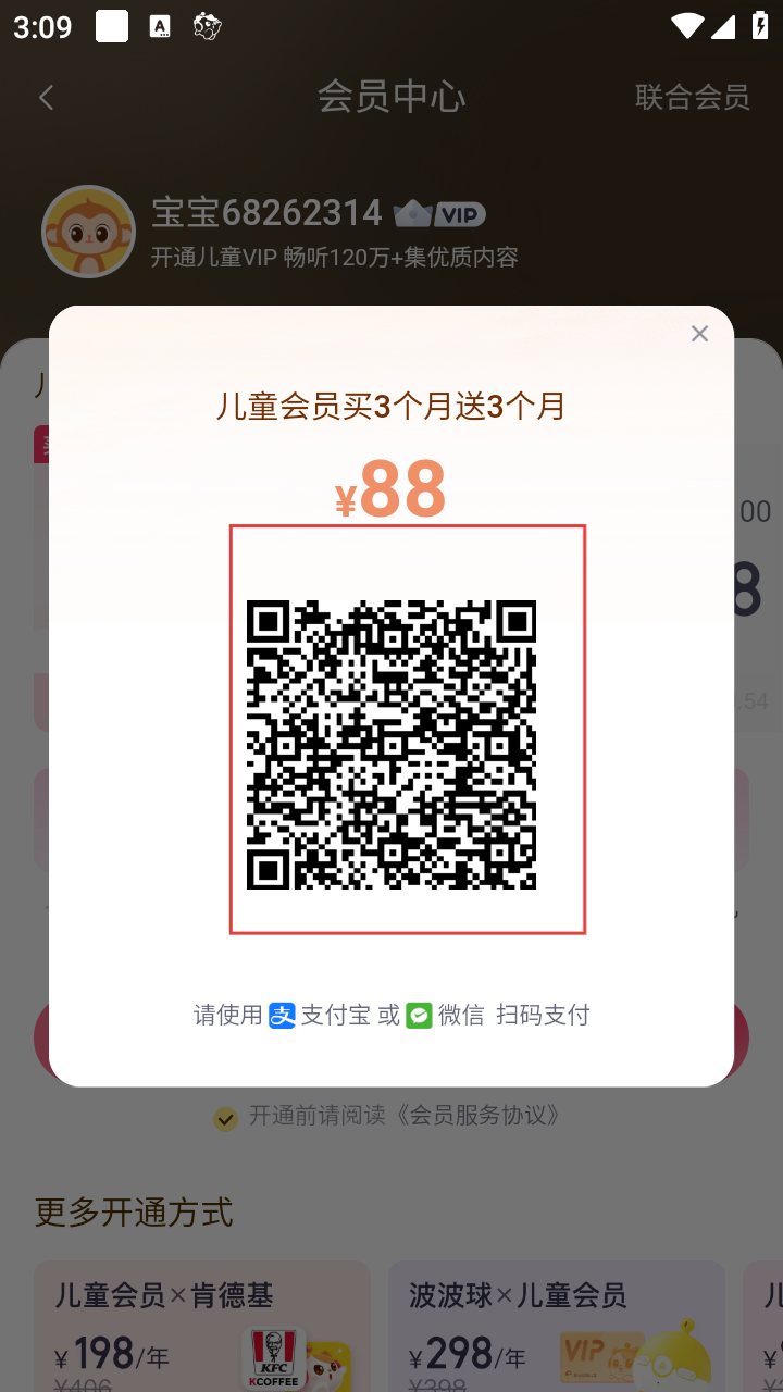 4、点击后会弹出支付二维码,使用支付宝或微信扫码支付,即可完成会员开通。