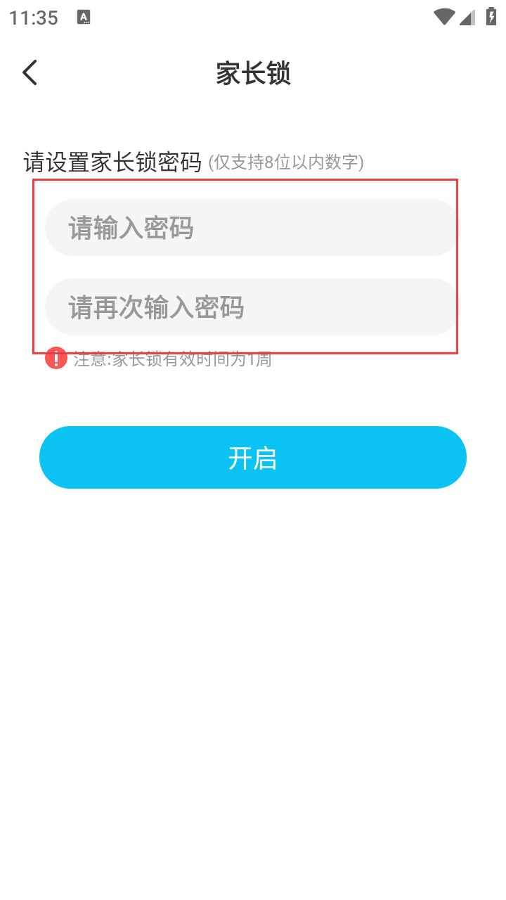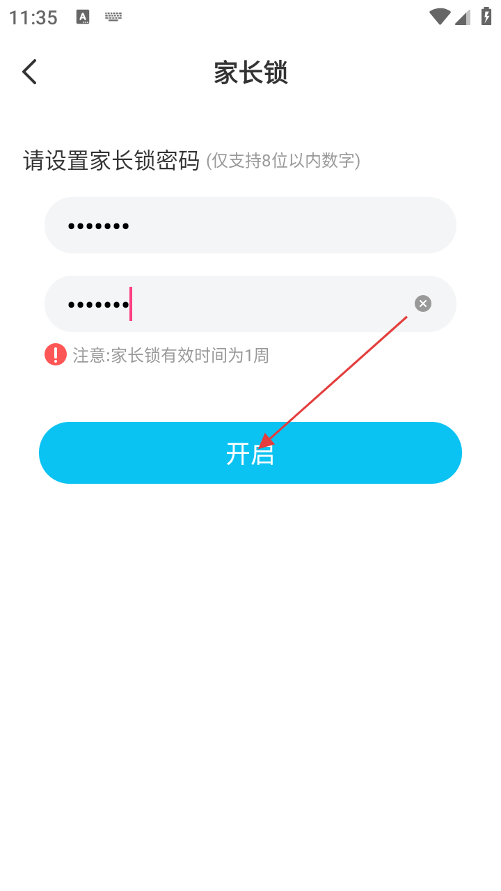 4、密码输入完成后,点击【开启】按钮,即可完成家长锁设置,家长锁有效时间为1周。