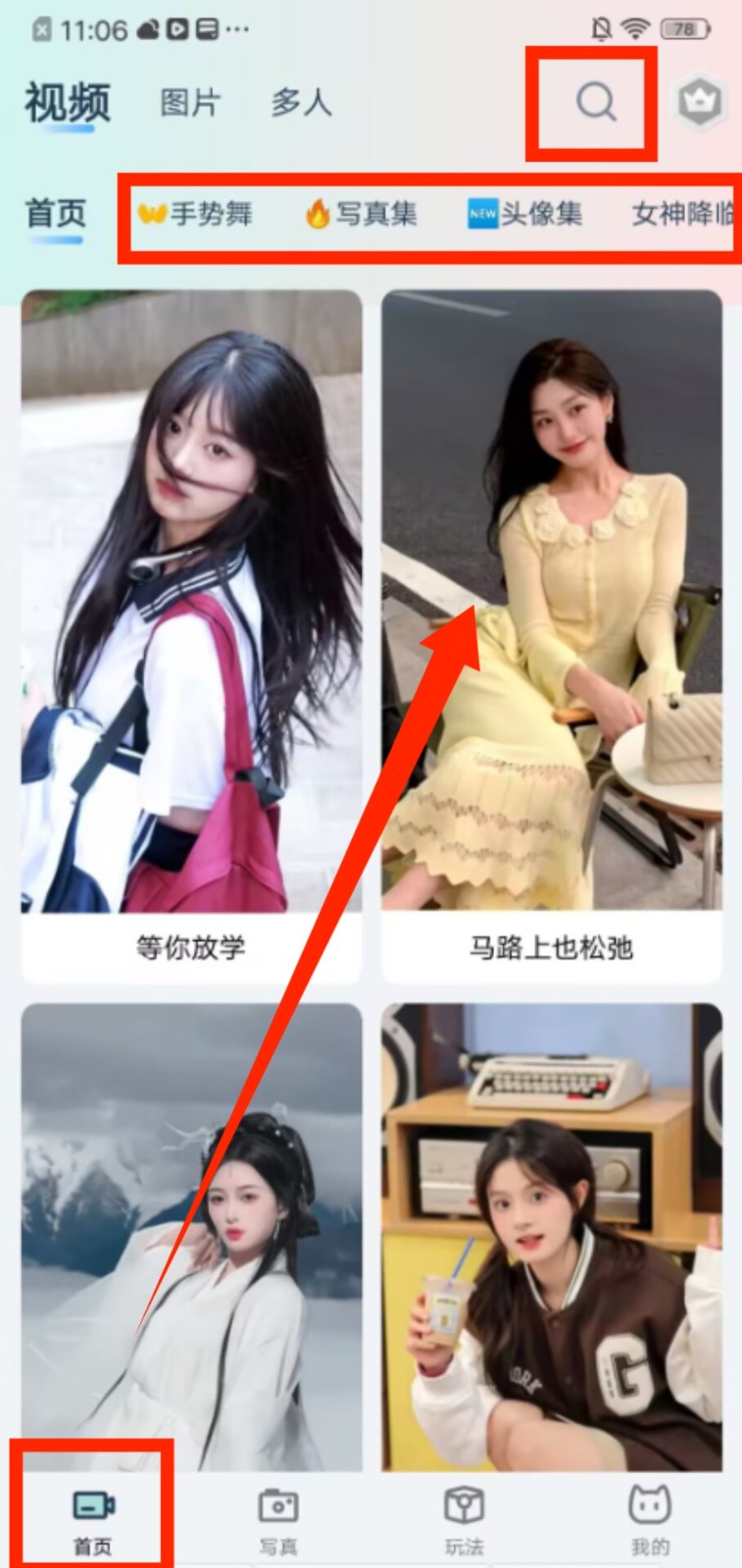 1、进入 “首页”,可通过顶部搜索框查找内容,也能在手势舞、写真集等分类里浏览素材。