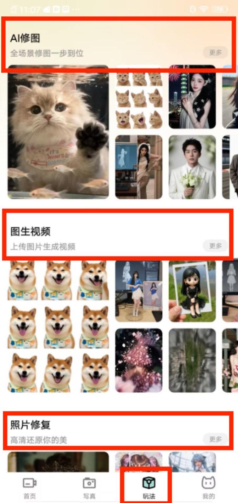 3、进入 “玩法” 页面,可体验 AI 修图、图生视频、照片修复等功能,点击 “更多” 查看完整选项。