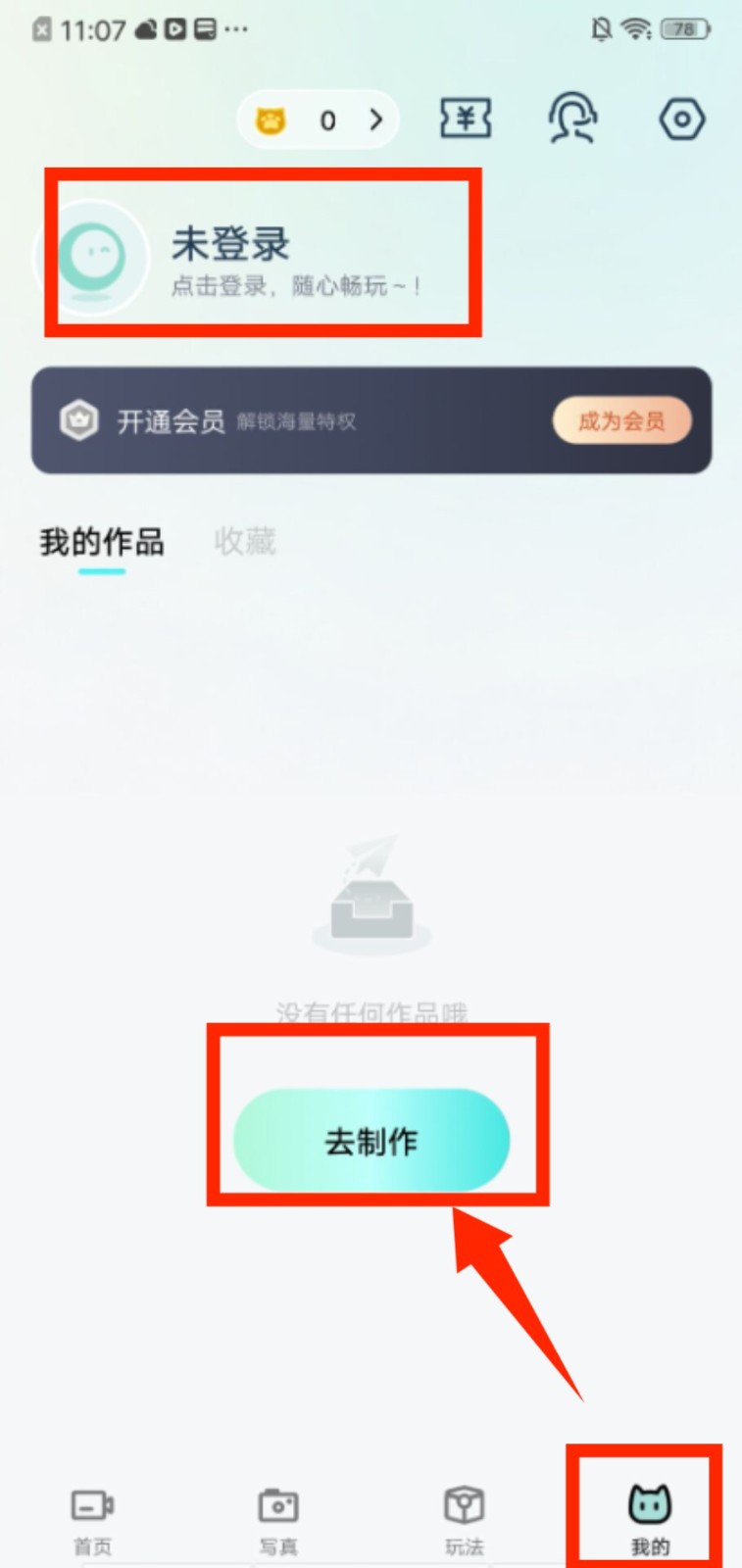 4、打开 “我的” 页面,点击 “去制作” 可启动创作流程,也能在此查看已完成的作品内容。