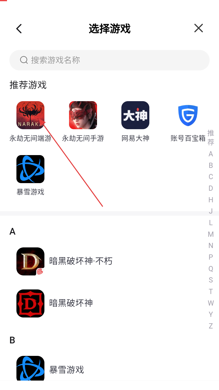 3、进入“选择游戏”页面,选择要咨询的游戏,比如《永劫无间端游》。