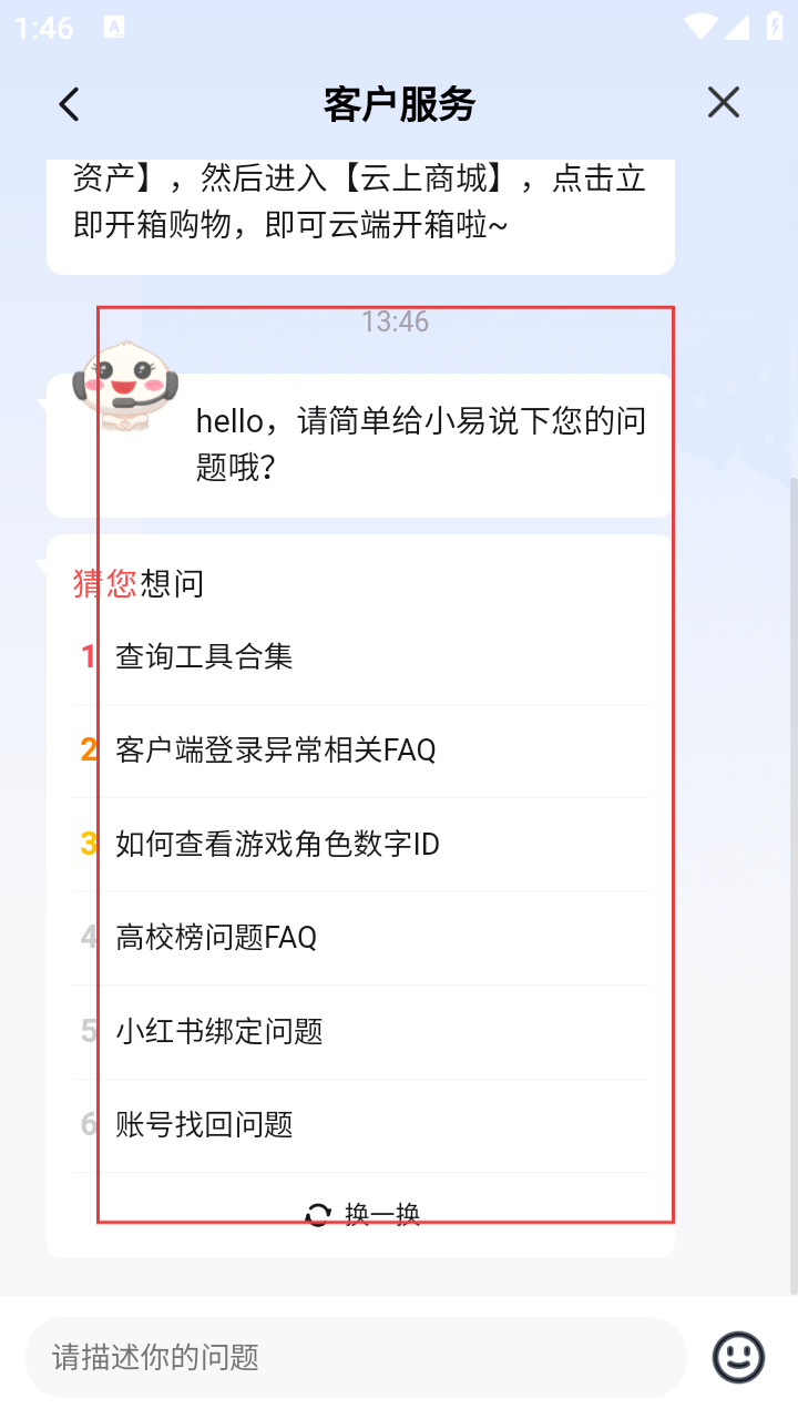 4、进入“客户服务”页面,可在“猜您想问”区域选择相关问题查看解答,也可在底部输入框中描述自己的问题,与客服进行沟通。