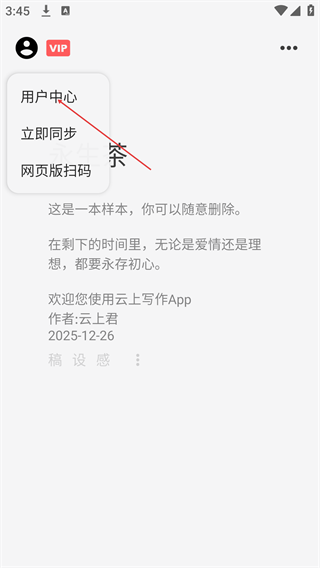 1、进入“云上写作”应用的文档页面,点击左上角的用户头像图标,弹出操作菜单。