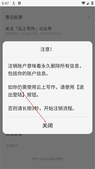4、在提示框中阅读注销说明(账户信息将永久删除),若确认注销,长按提示框区域3秒,即可启动账号注销流程。