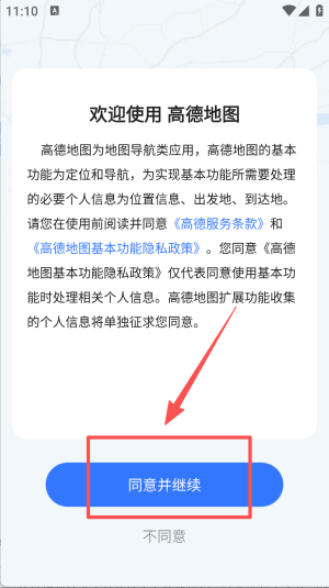 1、阅读隐私政策点击“同意并继续”,允许获取位置信息完成初始化。