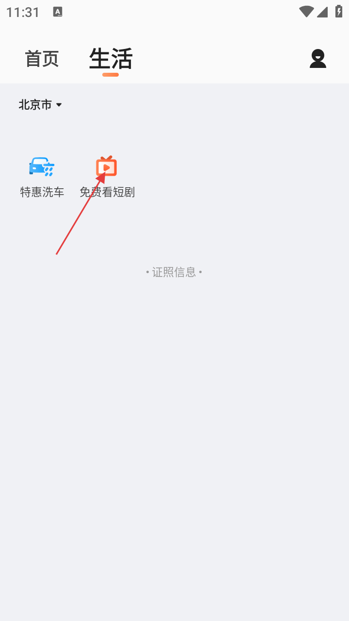 3、在生活页面,点击【免费看短剧】图标,进入短剧相关页面。