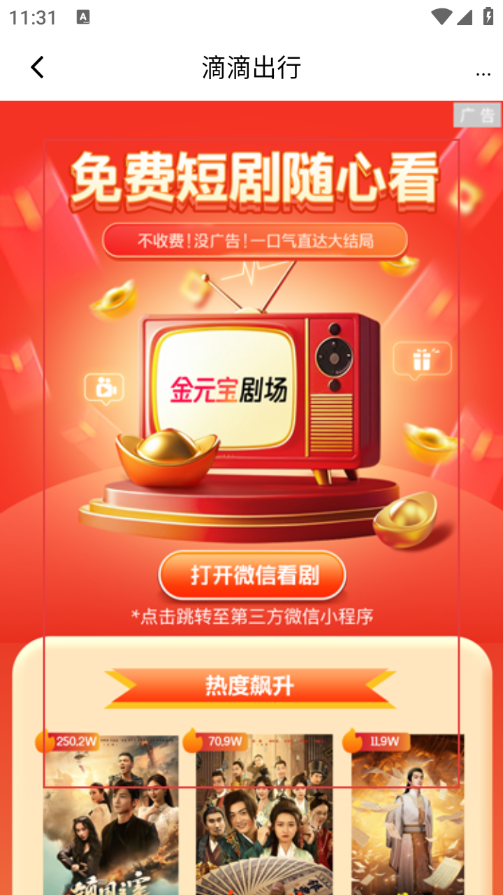 4、在短剧页面,可看到【免费短剧随心看】等内容,点击【打开微信看剧】按钮。