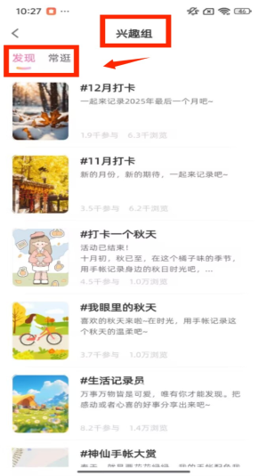 2、点击底部 “发现” 选项,进入后能看到各类兴趣组,比如 “12 月打卡”“打卡一个秋天” 等,可选择感兴趣的参与。