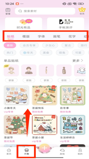 2、在首页点击想要使用的手帐内容,进入后选择底部 “市集”,可看到贴纸模板字体等功能选项,按需选取素材。