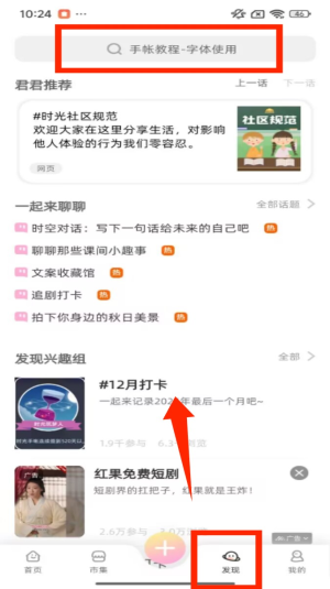 3、点击底部 “发现” 选项,进入后能在搜索框输入内容查找教程,还可参与话题讨论、加入兴趣组。