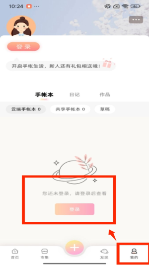 4、点击底部 “我的” 选项,进入后若未登录会提示登录,登录后可查看手帐本日记等内容,开启手帐记录。
