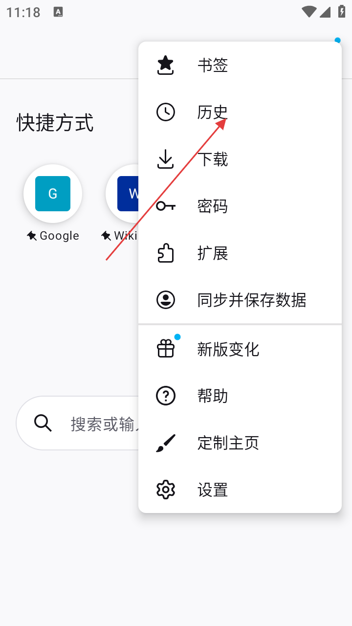 2、在展开的菜单中,点击【历史】选项,进入历史记录页面,查看之前访问过的网页记录。