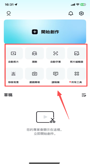 2、在首页点开始创作导入素材再选自动剪片或移除背景快速处理。