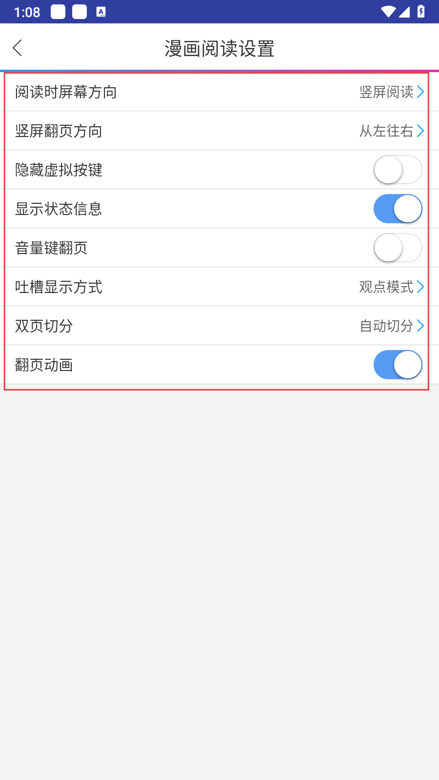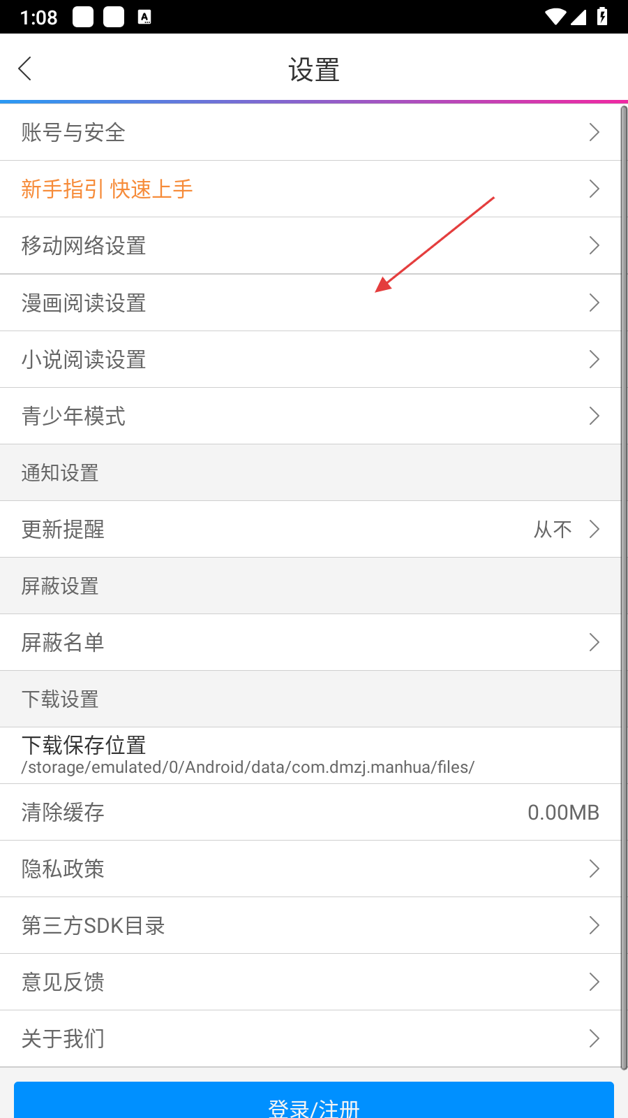 3、在设置页面,点击【漫画阅读设置】选项,可进入漫画阅读设置界面,自定义漫画阅读体验。