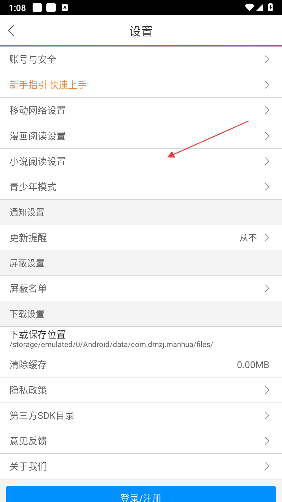 3、在设置页面,点击【小说阅读设置】选项,可进入小说阅读设置界面,自定义小说阅读体验。