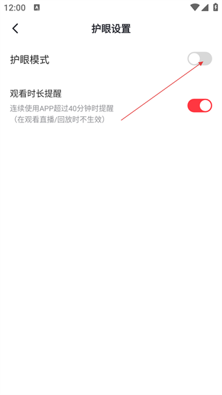 4、在“护眼设置”页面,可通过开关按钮开启【护眼模式】,同时该页面已默认开启【观看时长提醒】。