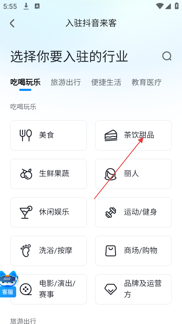2、在选择入驻行业页面,点击【茶饮甜品】选项,进入门店选择页面。