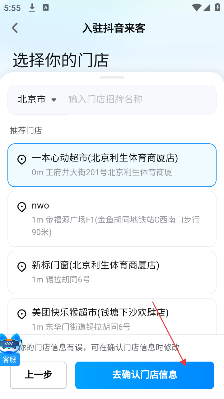 3、在门店选择页面,选好门店后,点击【去确认门店信息】按钮,进入门店信息确认页面。
