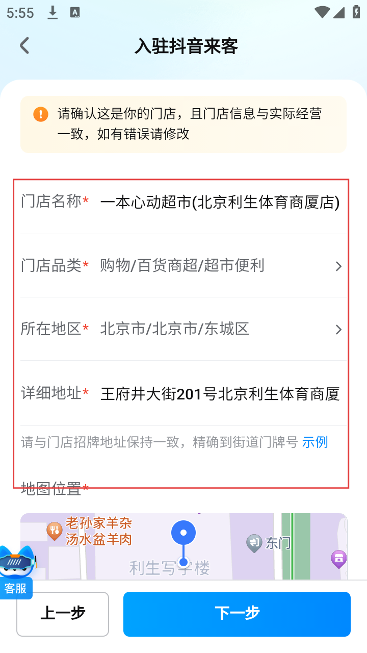 4、在门店信息确认页面,核对门店名称、品类、地区、地址等信息无误后,点击【下一步】按钮。