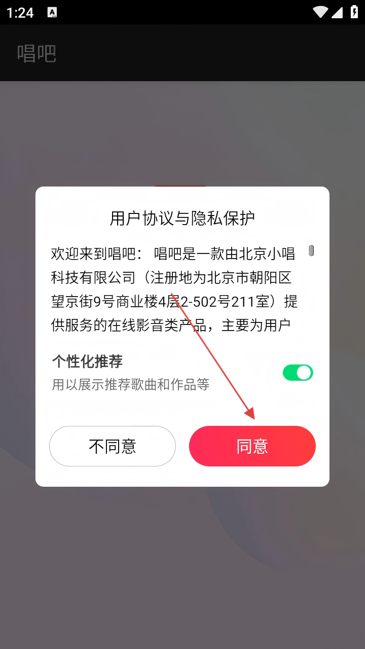 1、打开唱吧APP,弹出【用户协议与隐私保护】提示框,点击【同意】,进入后续操作页面。