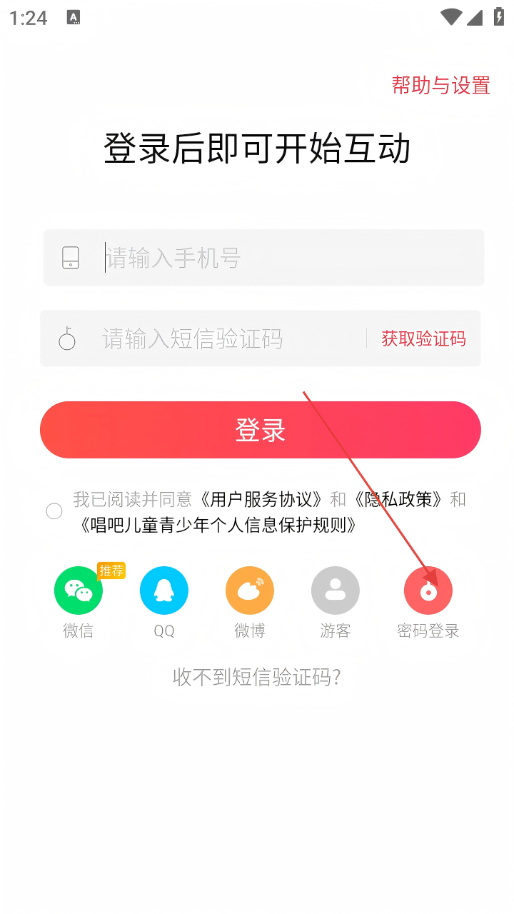 2、进入账号密码登录页面,输入【唱吧号/手机号/邮箱】和【请输入密码】,准备登录。