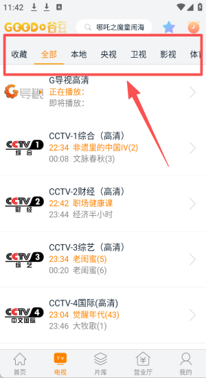 1、打开谷豆影视应用,点击首页的“电视”按钮,进入电视直播界面。