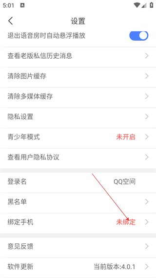 3、在设置界面,找到“绑定手机”选项,此时显示“未绑定”,点击进入。