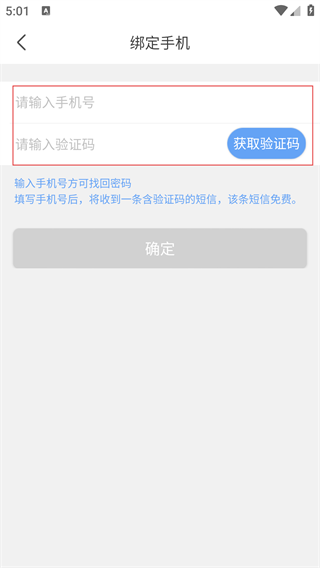 4、进入绑定手机页面后,输入手机号并获取验证码,填写后点击“确定”,即可完成手机绑定操作。