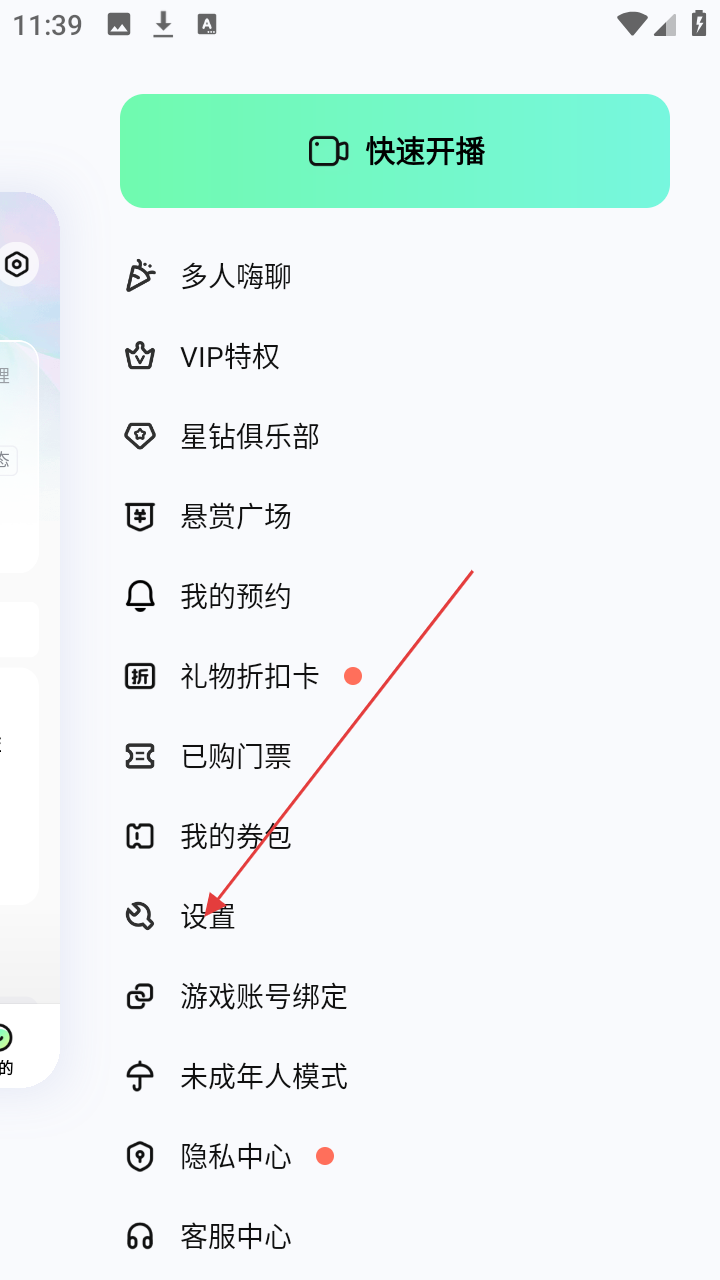 2、在设置菜单,有快速开播、VIP特权等选项,找到并点击【设置】,进入设置详情页面。
