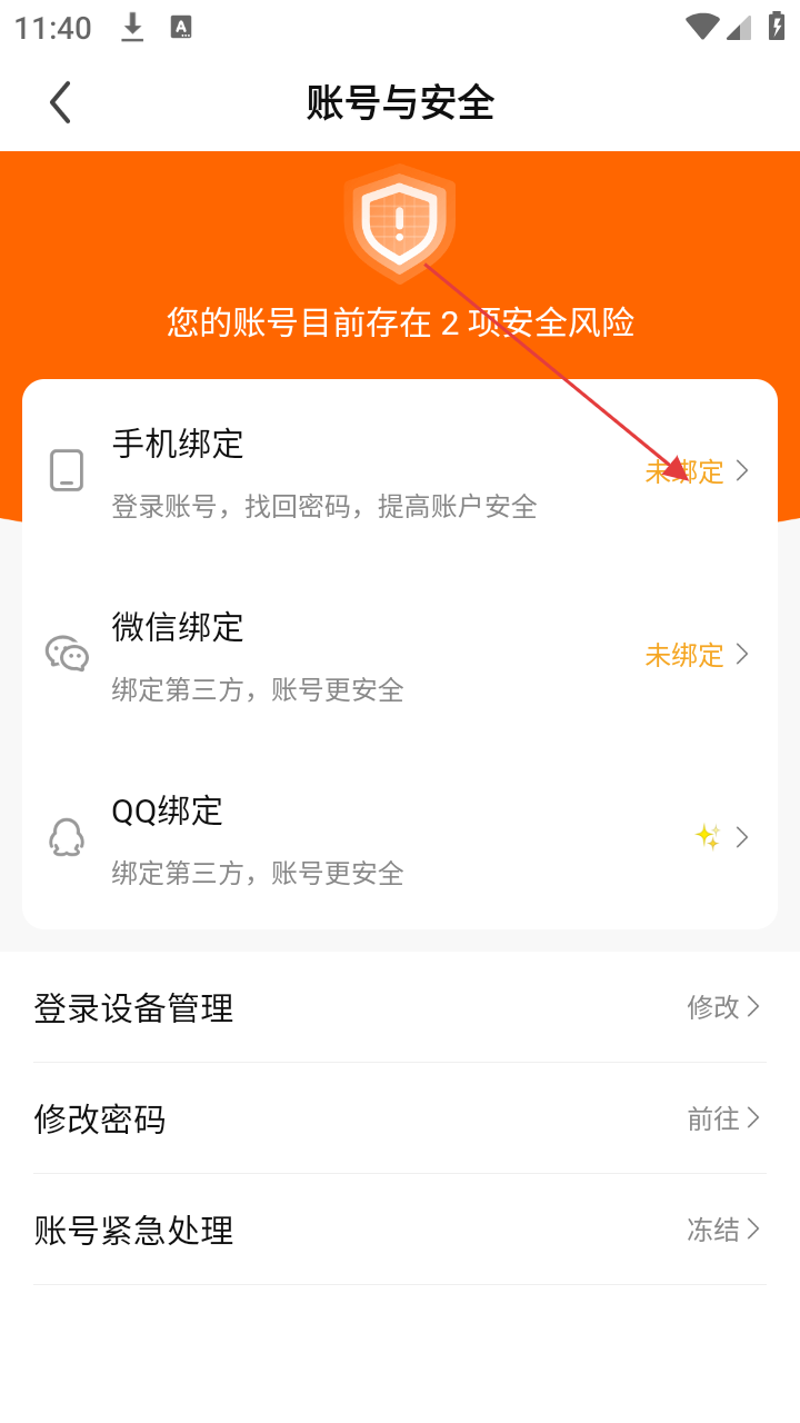4、在账号与安全页面,能看到账号存在2项安全风险,还有手机绑定、微信绑定等提升账号安全的选项。