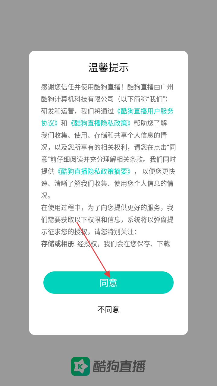 1、打开酷狗直播,会弹出温馨提示框,仔细阅读后点击【同意】,即可进入APP使用。
