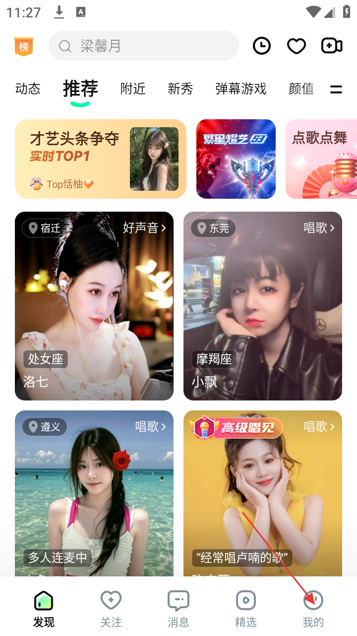 2、进入酷狗直播后,在发现页面有推荐、附近等分类,还有各类直播内容,点击右下角【我的】可进入个人页面。