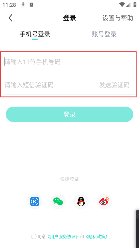 3、在登录页面,选择手机号登录,依次输入11位手机号码和短信验证码,也可选择快捷登录方式。