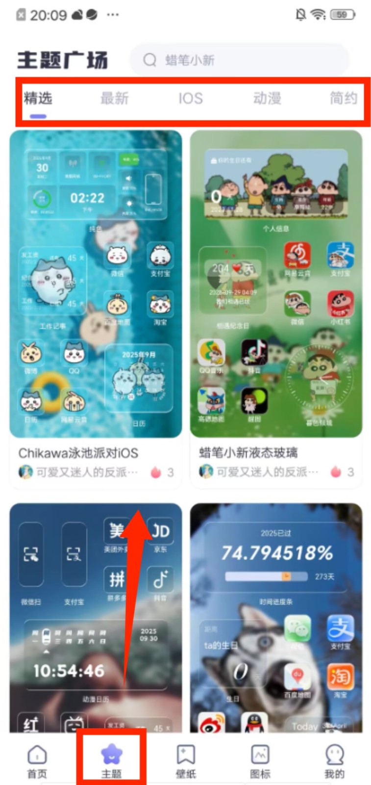 2、切换到主题页面,通过 “精选”“动漫” 等分类筛选,能找到风格适配的主题套装进行应用。
