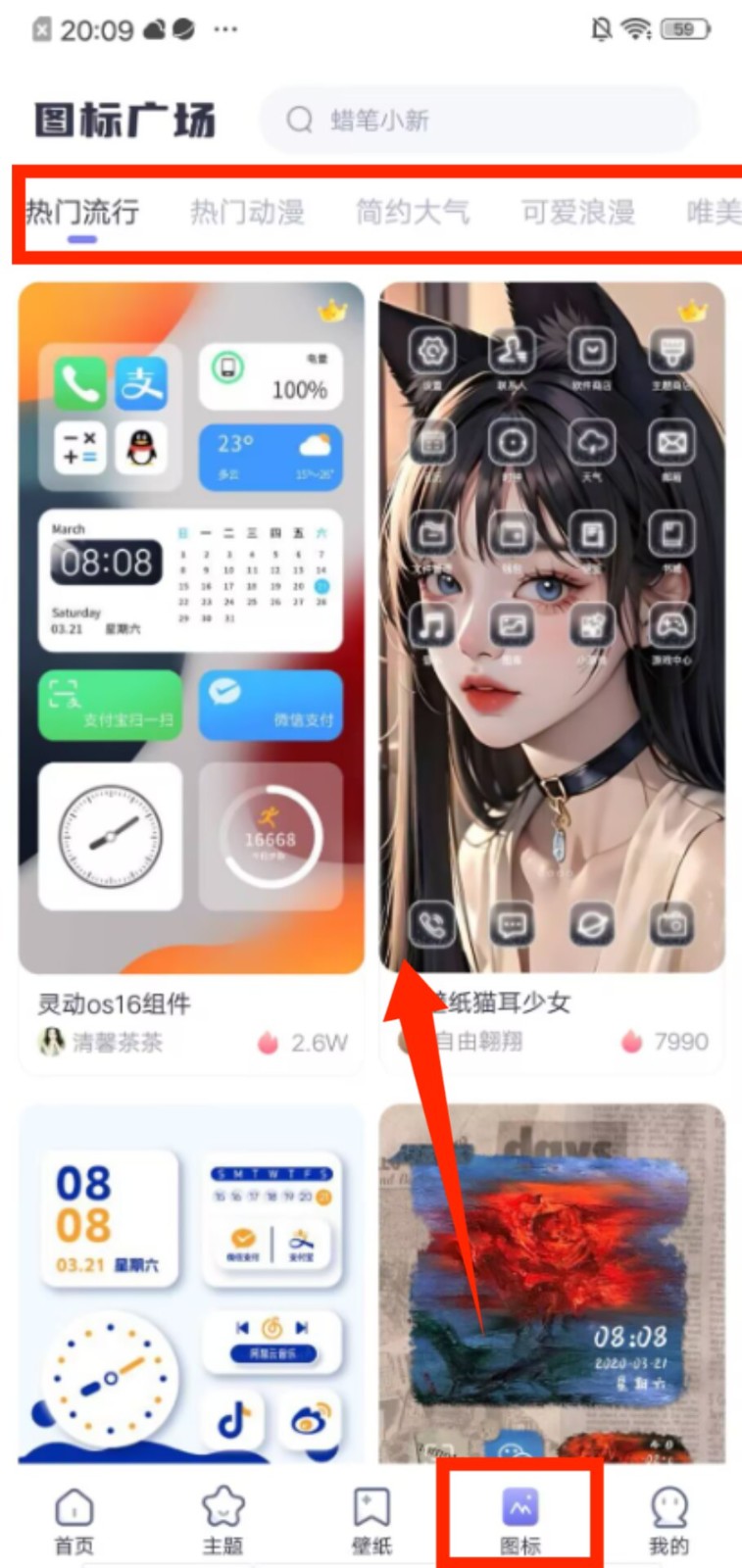 4、进入图标页面,在 “热门流行”“可爱浪漫” 等板块,更换应用图标样式来调整界面风格。