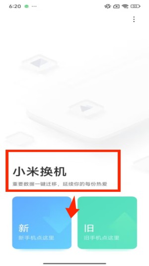 1、打开小米换机页面,页面显示 “重要数据一键迁移” 的提示,下方有 “新”“旧” 两个按钮,点击 “新” 进入旧机类型选择页。