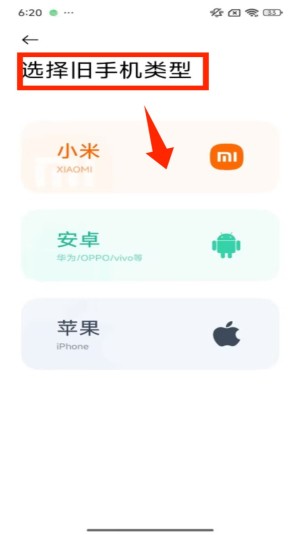 2、进入 “选择旧手机类型” 页面,可看到小米、安卓、苹果三个选项,选择 “小米” 后,跳转至旧机应用操作提示界面。