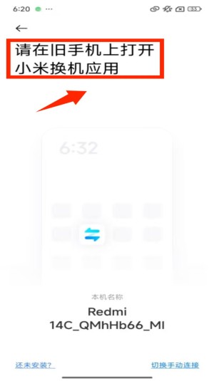 3、在旧机应用操作提示页,页面提示 “请在旧手机上打开小米换机应用”,同时显示当前新机的设备名称。