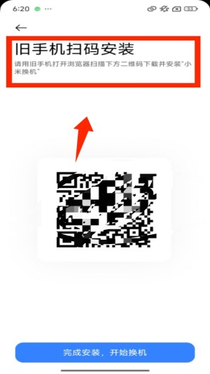 4、若旧机未安装该应用,点击对应选项后进入 “旧机扫码安装” 页,用旧机扫码下载安装,完成后点击按钮启动换机。