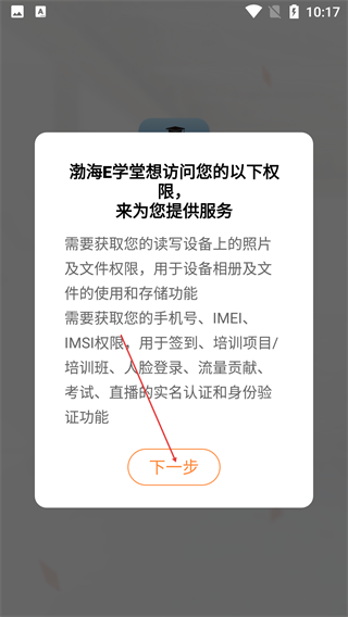 1、首次打开应用,会弹出权限申请弹窗,点击“下一步”进入权限确认环节。