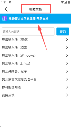 4、进入帮助文档板块,可查看奥云输入法在安卓、iOS 等多平台的帮助信息,还能进行关键词查询。