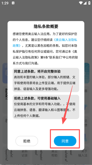 1、使用奥云输入法前,阅读隐私条款概要,点击同意即可开启完整体验模式。