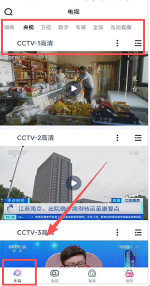 1、打开电视栏目选央视高清源,即刻观看湖南南京实时直播。
