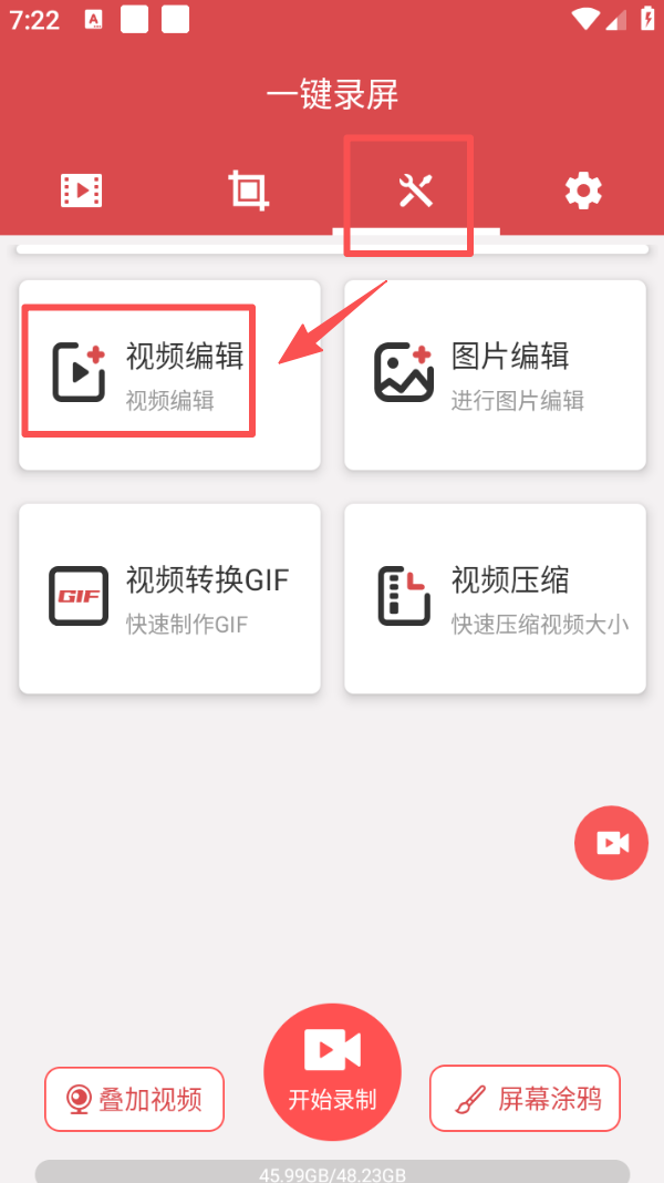 2、点击顶部工具图标,在展开的功能栏里选择 “视频编辑”,进入对应页面处理已有的视频素材。