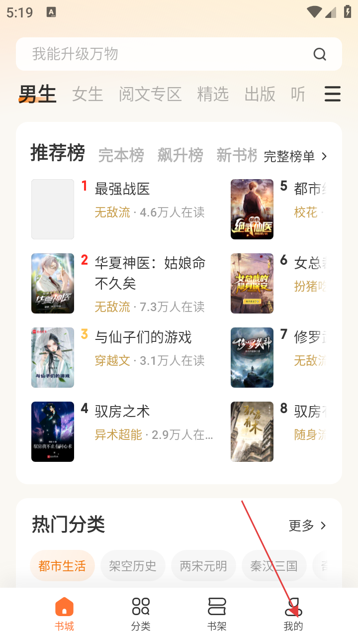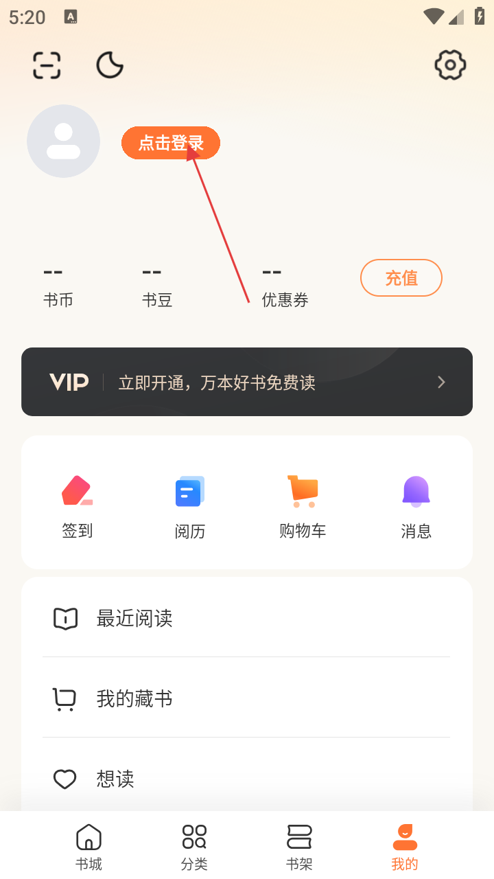 1、在小说APP书城界面,点击右下角【我的】按钮,可进入个人中心,查看登录、藏书、阅读记录等功能入口。