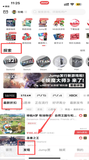3、在发现页面点击“最新折扣”,查看游戏优惠信息。