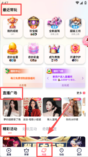 4、点击底部地盘,可查看最近常玩的功能入口,还有直播广场和精彩活动板块,展示各类直播和活动内容。