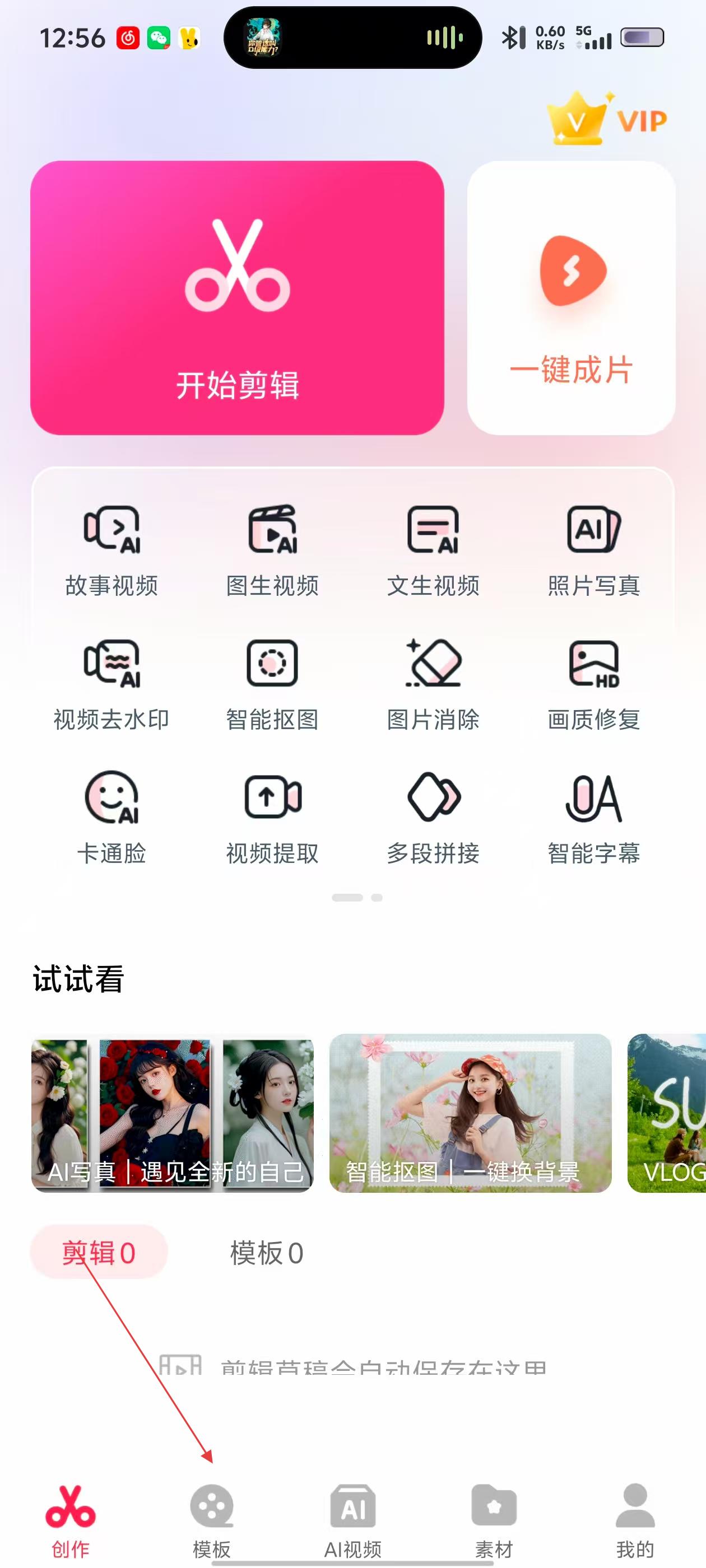 1. 打开快剪辑APP,进入主界面后,点击底部导航栏中的【模板】选项。
