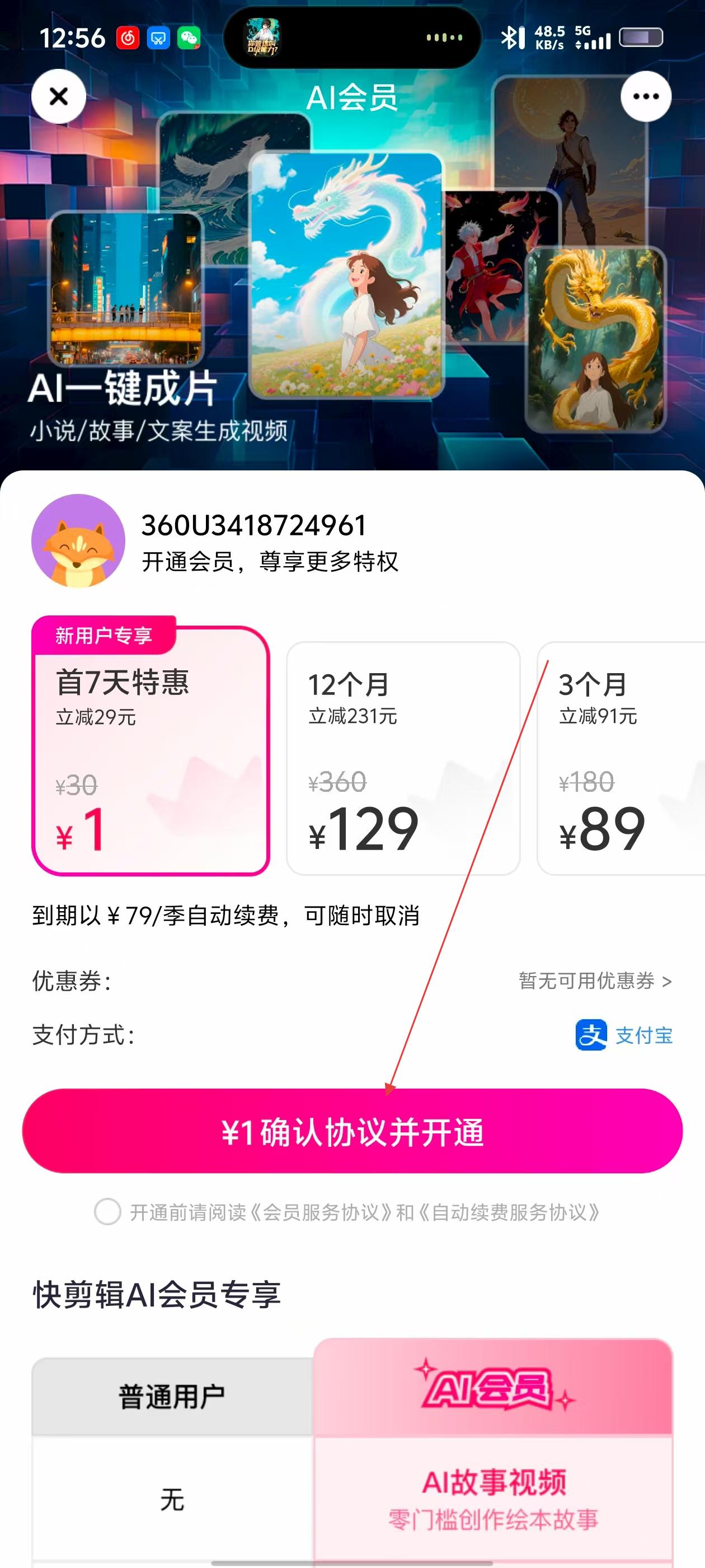 4. 弹出会员开通页面,选择合适的会员套餐,如首7天特惠1元套餐,完成会员开通,再进行制作同款操作即可。